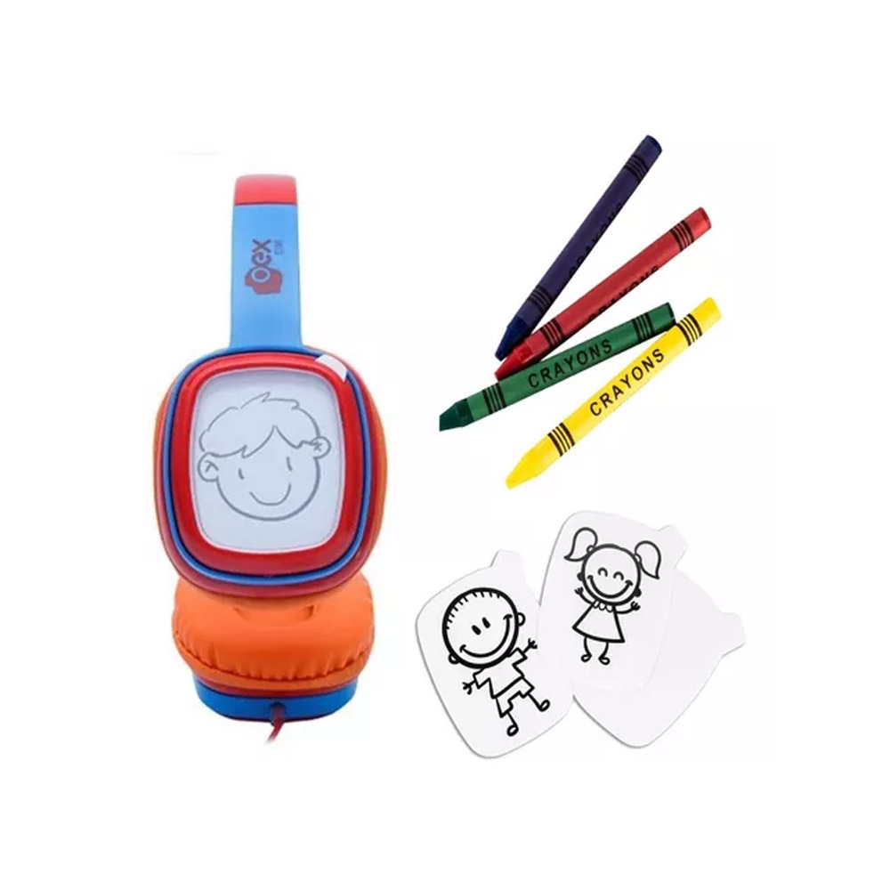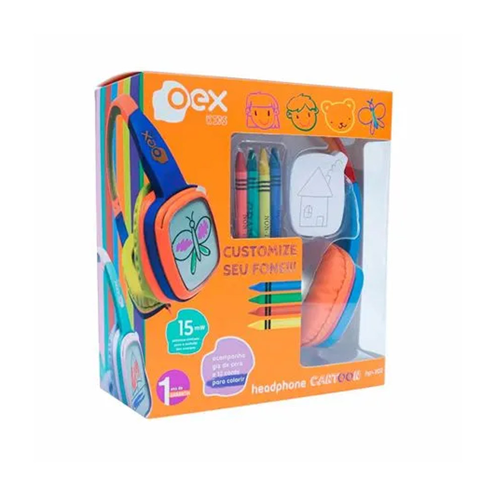 Customize seu fone! O Headphone Cartoon acompanha 12 cards (4 ilustrados e 8 em branco) e giz de cera em 4 cores para customizar o fone.
