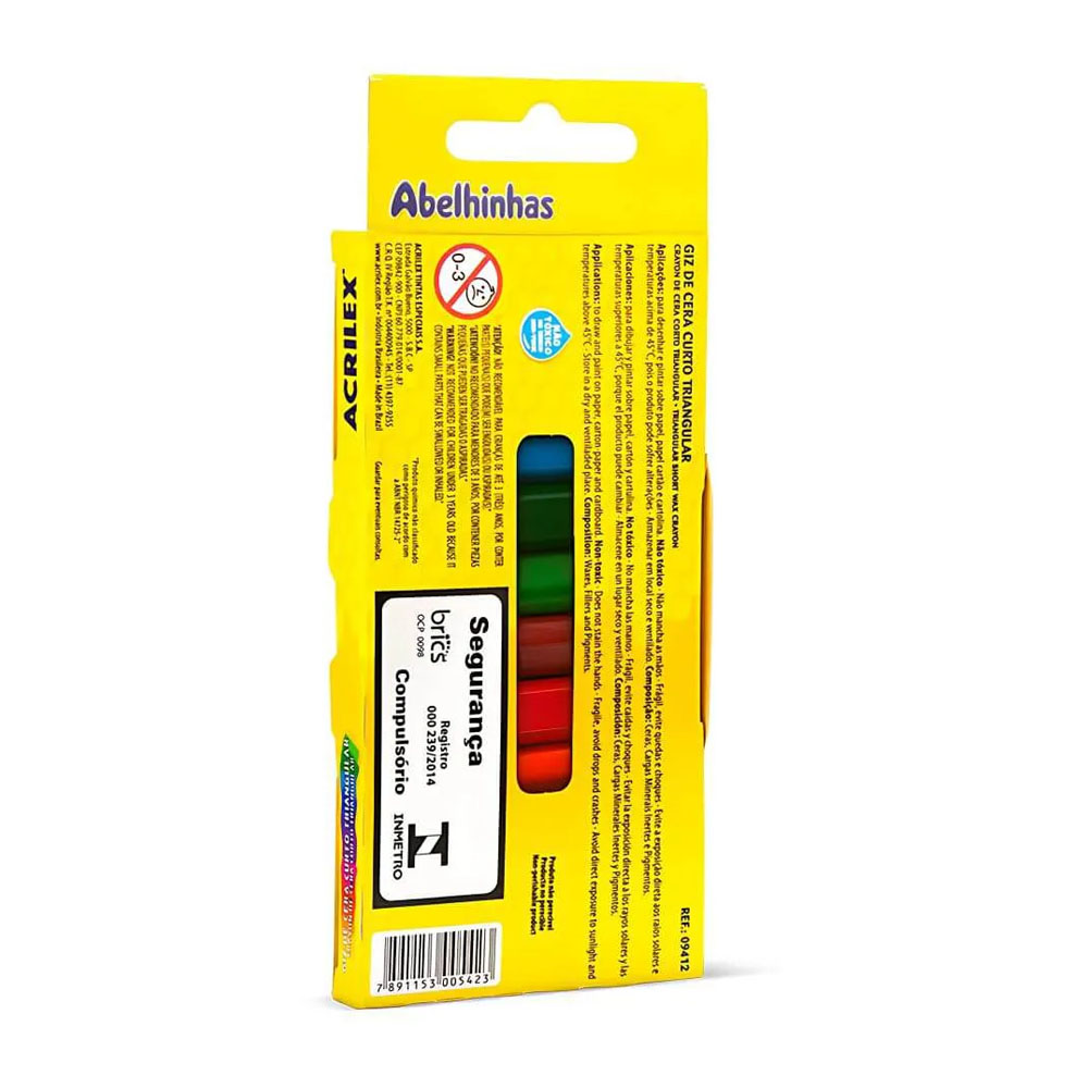 Giz de Cera curto triangular Acrilex. Desenvolvido para trabalhos infantis, ajudando a criança no aprendizado da escrita e no desenvolvimento de sua coordenação motora. É triangular, fabricado com ceras de alta qualidade, proporcionando traço e cobertura de grandes áreas sem esforço. Para desenhar, escrever e pintar sobre papel, cartolina, papel cartão e também para trabalhos com acabamentos artísticos. Embalagem com 12 unidades.