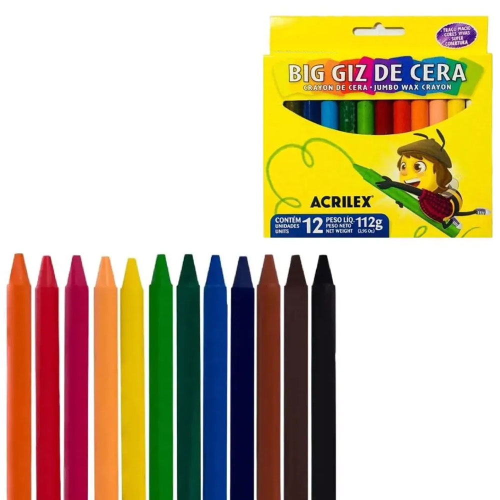 Giz de Cera Jumbo Acrilex . Caixa com 12 cores de Giz de Cera. O Giz de Cera Acrilex foi desenvolvido para trabalhos infantis, ajudando a criança no aprendizado da escrita e no desenvolvimento de sua coordenação motora. É ideal para o uso na pré-escola e em trabalhos escolares diversos. É anatômico, fabricado com ceras de alta qualidade, proporcionando traço e cobertura de grandes áreas sem esforço. Para desenhar, escrever e pintar sobre papel, cartolina, papel cartão e também para trabalhos com acabamentos artísticos. Produto atóxico.