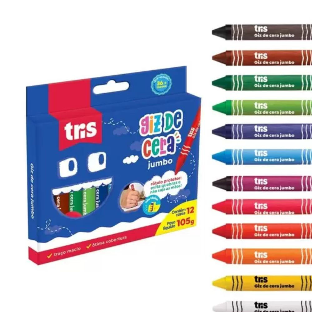 Nosso giz de cera JUMBO auxilia no aprendizado e estimula a criatividade, possui rótulo protetor que não suja as mãos e corpo triangular, que é ideal para as mãozinhas pequenas. É pré-apontado, de traço macio, ótima cobertura e atóxico.