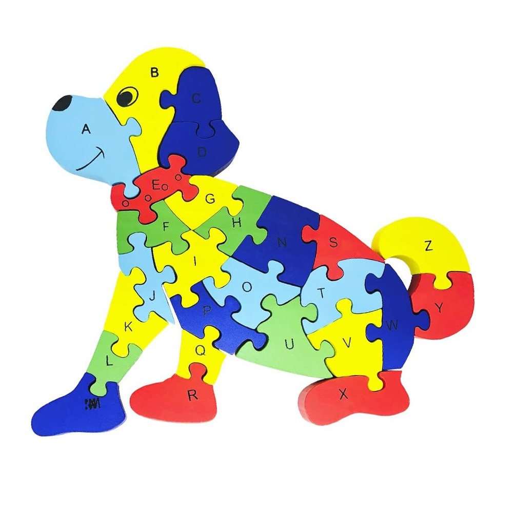 Quebra-cabeça educativo em formato de Cachorro com 26 peças coloridas. De um lado as vogais, do outro a sequência de números 1 a 26. Brinquedo confeccionando artesanalmente em madeira de reflorestamento e pintado com tinta atóxica.
