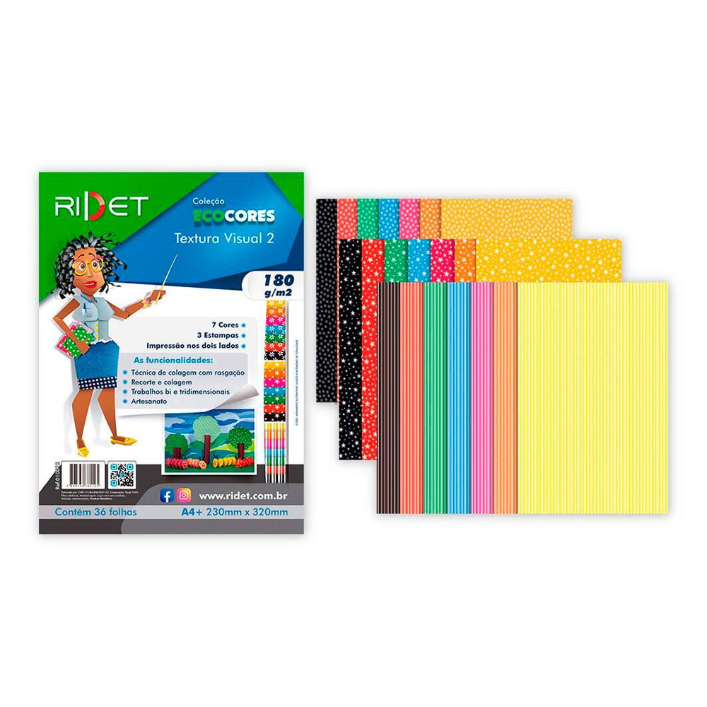 Ideal para trabalhos escolares, artesanato e projetos criativos, o papel da coleção ECOCORES da RIDET traz uma combinação única de 7 cores e 3 estampas com textura visual, impressas em ambos os lados para mais versatilidade. Com gramatura de 180g/m², oferece excelente resistência e qualidade para técnicas como recorte, colagem, trabalhos 3D e uso com tesoura de picote.