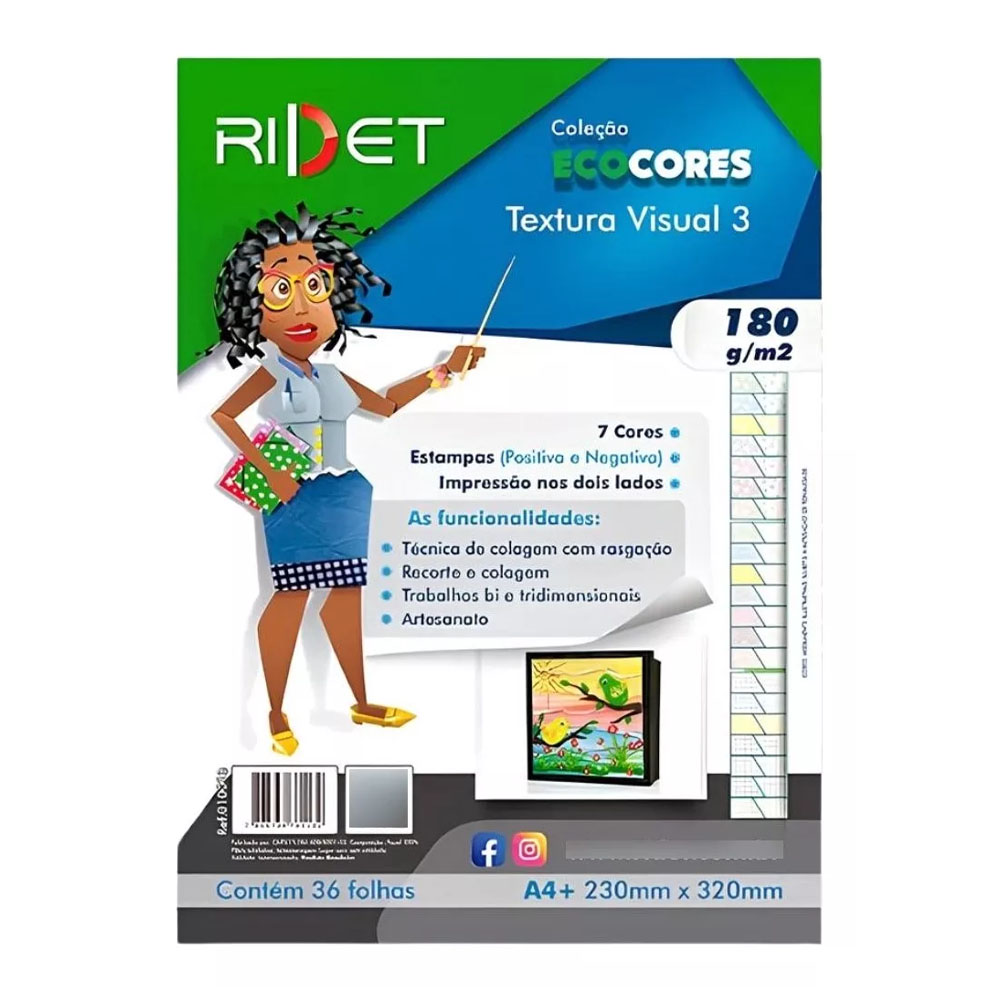 O Bloco Papel Textura Ridet Visual 3 A4+, com 180g e 36 folhas, oferece uma experiência tátil única com suas 7 cores distintas. Com dimensões A4+ (23x32cm), é ideal para projetos artísticos que buscam adicionar uma dimensão sensorial ao papel. As sete cores e 3 estampas proporcionam uma variedade de superfícies que podem ser exploradas em desenhos, pinturas, colagens e outros trabalhos criativos.