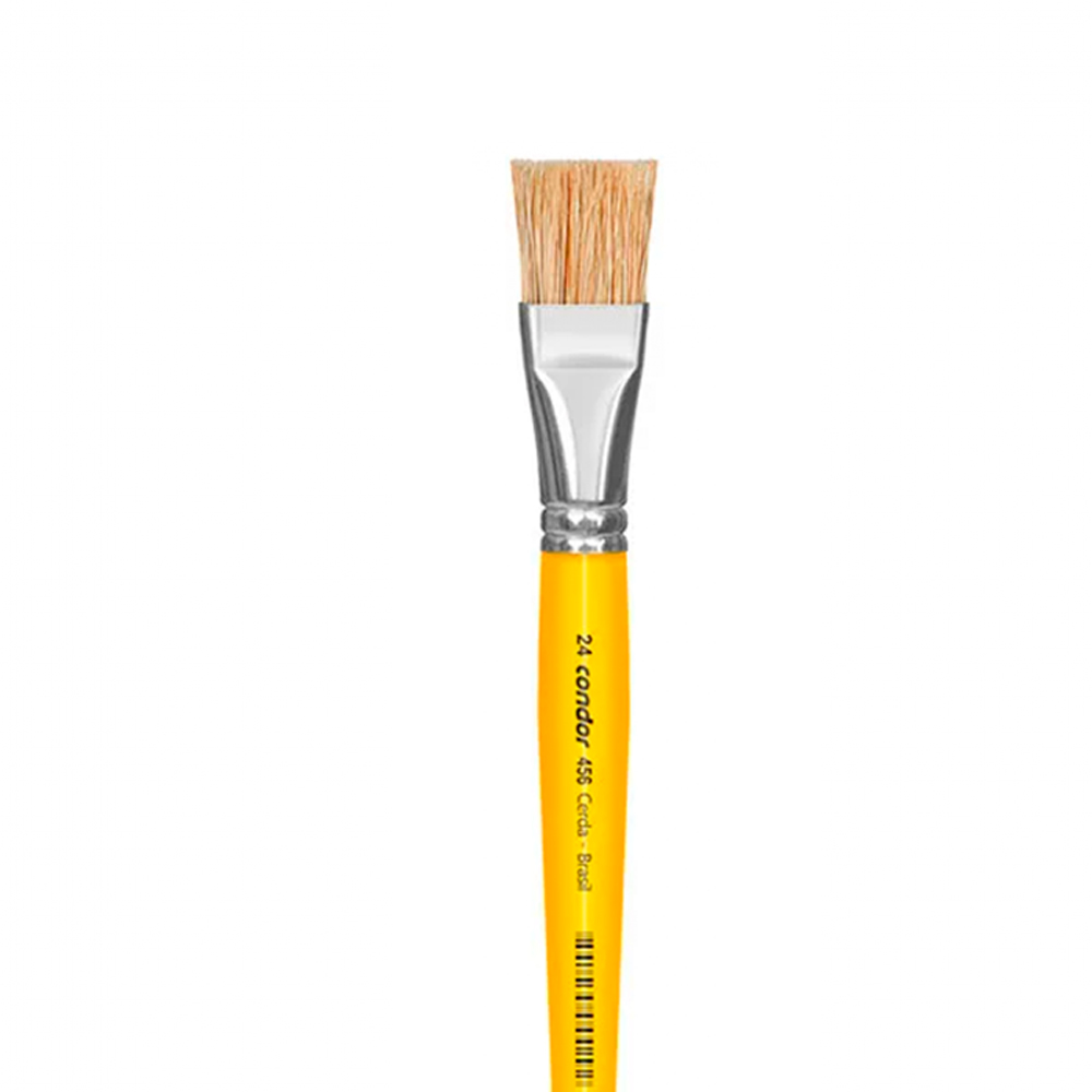 Pincel Escolar Chato Condor Descrição e especificações do pincel: Os pincéis de pintura são usados para a aplicação de tinta ou auxiliares para pintura. São produzidos usualmente pela fixação dos pelos ao cabo por uma cinta metálica, a virola. Pincéis de pintura têm dois formatos básicos: Redondo: os pelos longos, arranjados de forma compacta, deste tipo de pincel permitem reter mais tinta que outros pincéis de mesmo tamanho, mas formato diferente. Por isso, muitos artistas preferem-no ao colorir grandes áreas. Chato: espalham melhor a tinta.
