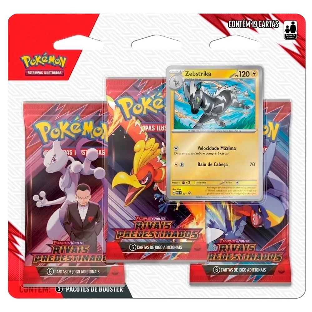 Contém: 1 Blister com 3 booster da coleção Rivais Predestinados com 6 cartas cada + 1 Carta Exclusiva (Aleatória)