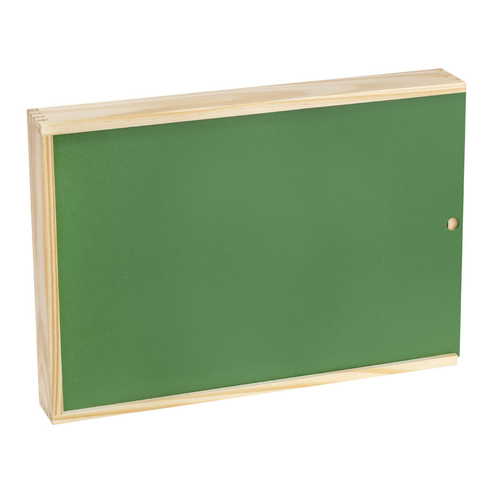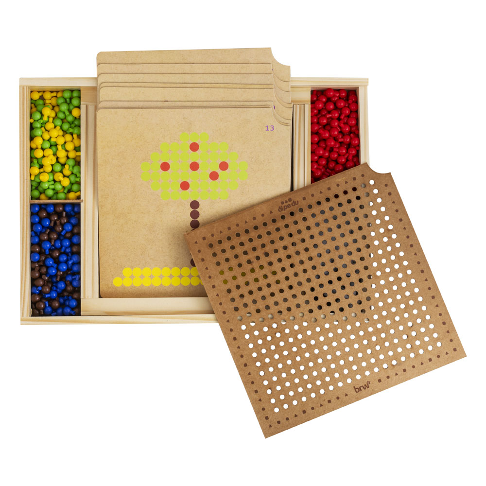 514 peças. Sendo 08 placas medindo 208 mm x 208 mm x 3 mm com modelos para fazer as figuras, 01 placa de 235 mm x 235 mm x 3 mm com orifícios como gabarito, 505 contas coloridas em plástico: 140 vermelhas, 110 ancas, 60 verdes, 60 marrons, 50 azuis, 60 amarelas e 25 pretas, acondicionadas em uma caixa de madeira medindo 380 mm x 265 mm x 50 mm.