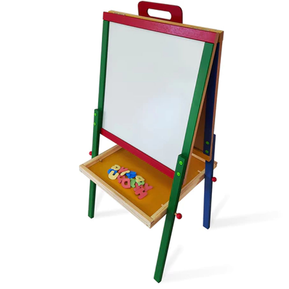 Um quadro 3 em 1 super fácil de montar e guardar em qualquer lugar. Um lado ele é quadro branco magnético para escrever com marcador e fixar figuras imantadas e o outro lado é quadro verde para explorar com giz.