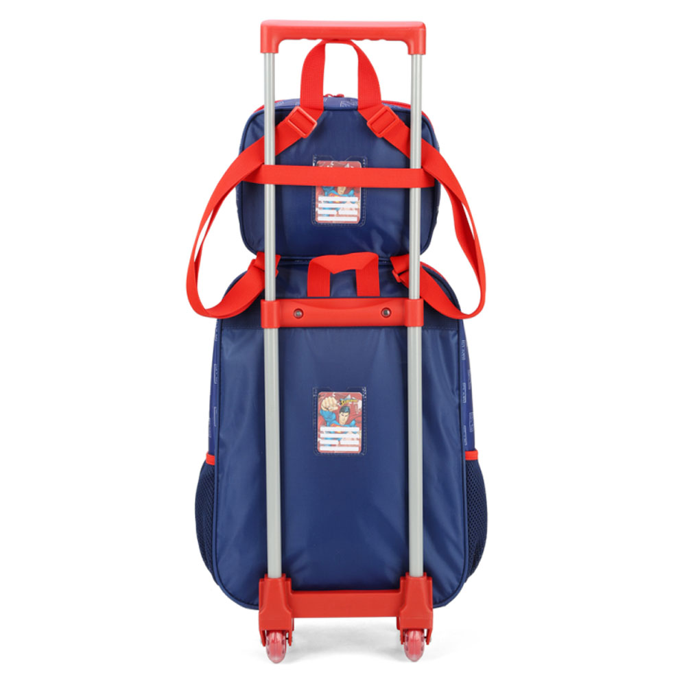 O Kit Mochila de Rodinhas com Lancheira do Superman é perfeito para acompanhar seu filho no ano escolar; A mochila é leve, resistente e combina com vários ambientes como escola e passeio. Tenha praticidade e conforto para transportar todos os seus objetos, com segurança e muito charme. A mochila conta com 01 bolso principal, 1 Frontal e 02 bolsos laterais para garrafas. Conta também com alça de mão, além disso a mochila conta com etiqueta de identificação na parte traseira. Possui 2 rodinhas traseiras em gel. Material: 70% Poliéster 30%PVC.