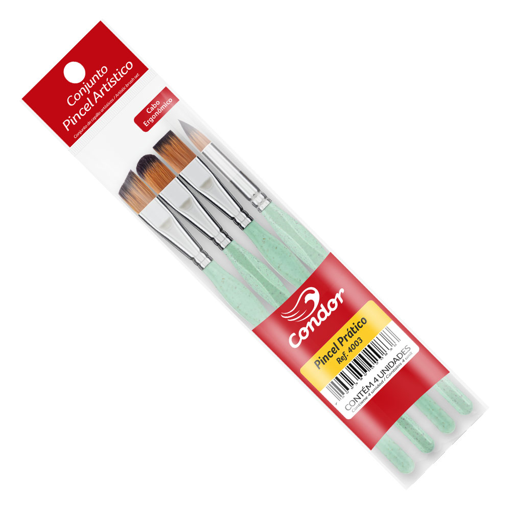 Contém 1 pacote com 4 pincéis (Modelos: Chanfrado, Língua de Gato, Chato e Redondo)