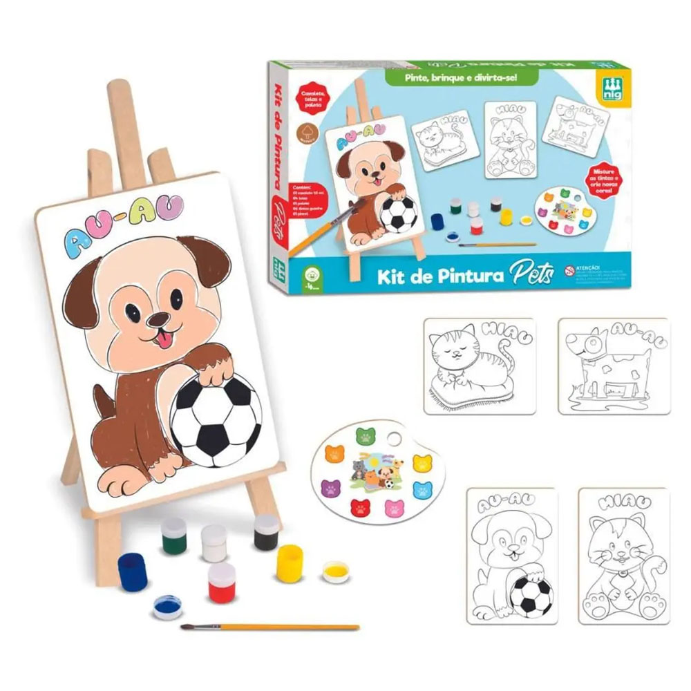 Kit de pintura que estimula a criatividade da criança enquanto se diverte, auxiliando na coordenação motora pintando os pets fofinhos.