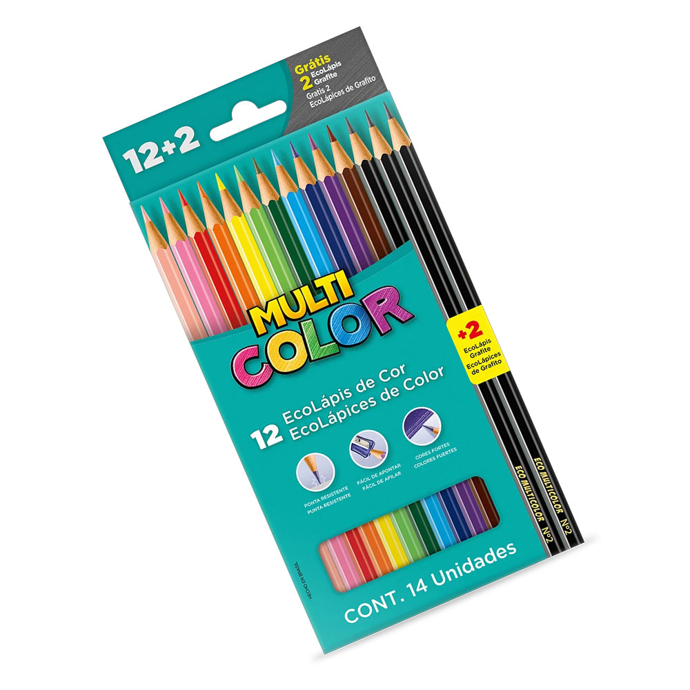 O Lápis de cor Ecolápis caixa com 12 cores + 2 lápis grafite. Grafite super macio e resistente. Maior cobertura do desenho. Maior vida útil do lápis de cor.