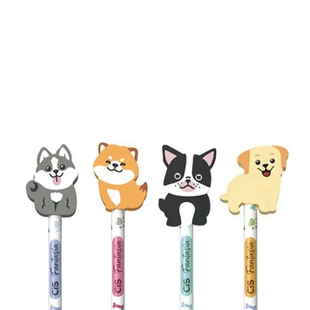 Lápis de escrever decorado. Possui corpo redondo com desenhos de patinhas e ossinhos e borracha divertida no topo com pets fofinhos.