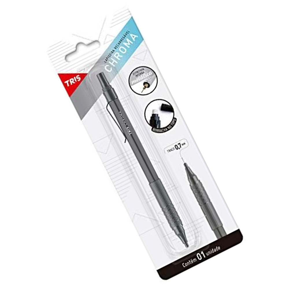 Com design diferenciado, robusta e acabamento impecável, a nova TRIS Chroma chegou para quem busca uma lapiseira de alta qualidade. Tem estrutura interna metálica, borracha no topo, grip com textura e traço 0,7mm. Cor grafite.