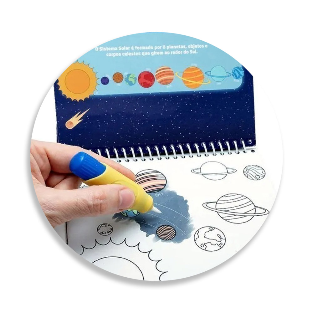 Encadernado em espiral, o livro possui 4 cenas com o tema das Galáxias para colorir com pincel com reservatório de água que acompanha. Saiba como funciona: as cores e imagens ficam escondidas e são reveladas instantaneamente assim que entram em contato com a água. E desaparecem ao secar em alguns minutos, podendo ser usado novamente logo em seguida!