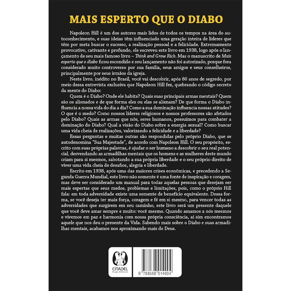 Neste livro, inédito no Brasil, você vai descobrir, após 75 anos de segredo, por meio dessa entrevista exclusiva que Napoleon Hill fez, quebrando o código secreto da mente do Diabo: Quem é o Diabo? Onde ele habita? Quais suas principais armas mentais? Quem são os alienados e de que forma eles ou elas se alienam? De que forma o Diabo influencia a nossa vida do dia a dia? Como a sua dominação influencia nossas atitudes? O que é o medo? Como nossos líderes religiosos e nossos professores são afetados pelo Diabo? Quais as armas que nós, seres humanos, possuímos para combater a dominação do Diabo? Qual a visão do Diabo sobre a energia sexual? Como buscar uma vida cheia de realizações, valorizando a felicidade e a liberdade? Essas perguntas e muitas outras são respondidas pelo próprio Diabo, que se autodenomina “Sua Majestade”, de acordo com Napoleon Hill. O seu propósito, escrito com suas próprias palavras, é ajudar o ser humano a descobrir o seu real potencial, desvendando as armadilhas mentais que os homens e as mulheres deste mundo criam para si mesmos, sabotando a sua própria liberdade e o seu próprio direito de viver uma vida cheia de desafios, alegria e liberdade. Escrito em 1938, após uma das maiores crises econômicas, e precedendo a Segunda Guerra Mundial, este livro não somente é uma fonte de inspiração e coragem, mas deve ser considerado um manual para todas aquelas pessoas que desejam