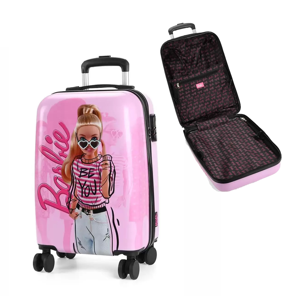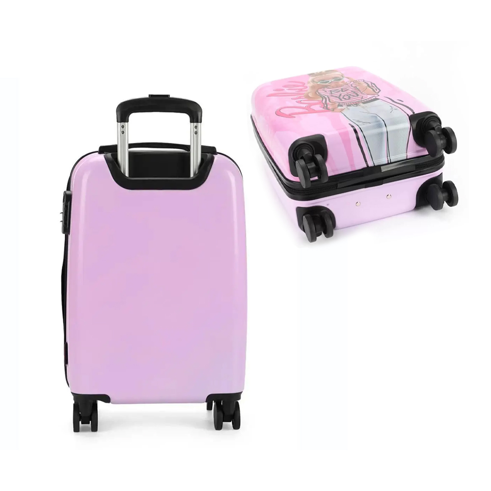 Malinha Escolar Bordo Barbie Rosa. Malinha toda confeccionada em material fibra ABS impermeável .material firme que protege os materiais escolares e pertences de viagem (ela serve para as duas funções), com desenho frontal do personagem. Abertura Lateral, possui compartimentos internos com ziper. Sistema de rodinhas de silicone preparados para aguentar o peso dos materiais, com rodas duplas e maiores para melhor deslizar. Puxador em metal resistente com haste dupla e estágios de regulagem de altura podendo ser adaptado para crianças de diversos tamanhos. Cadeado com segredo numérico podendo ser escolhido o número de preferência para maior segurança. Ideal para crianças que possuem muito material, estudo integral e diversas idades.
