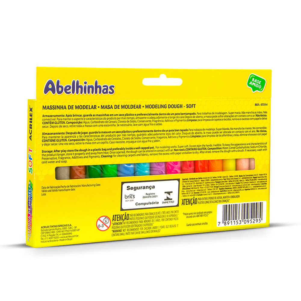 Massinha de modelar Soft com 15 cores, à base de amido super macia, com aroma de tutti-frutti. Cores vivas e brilhantes.