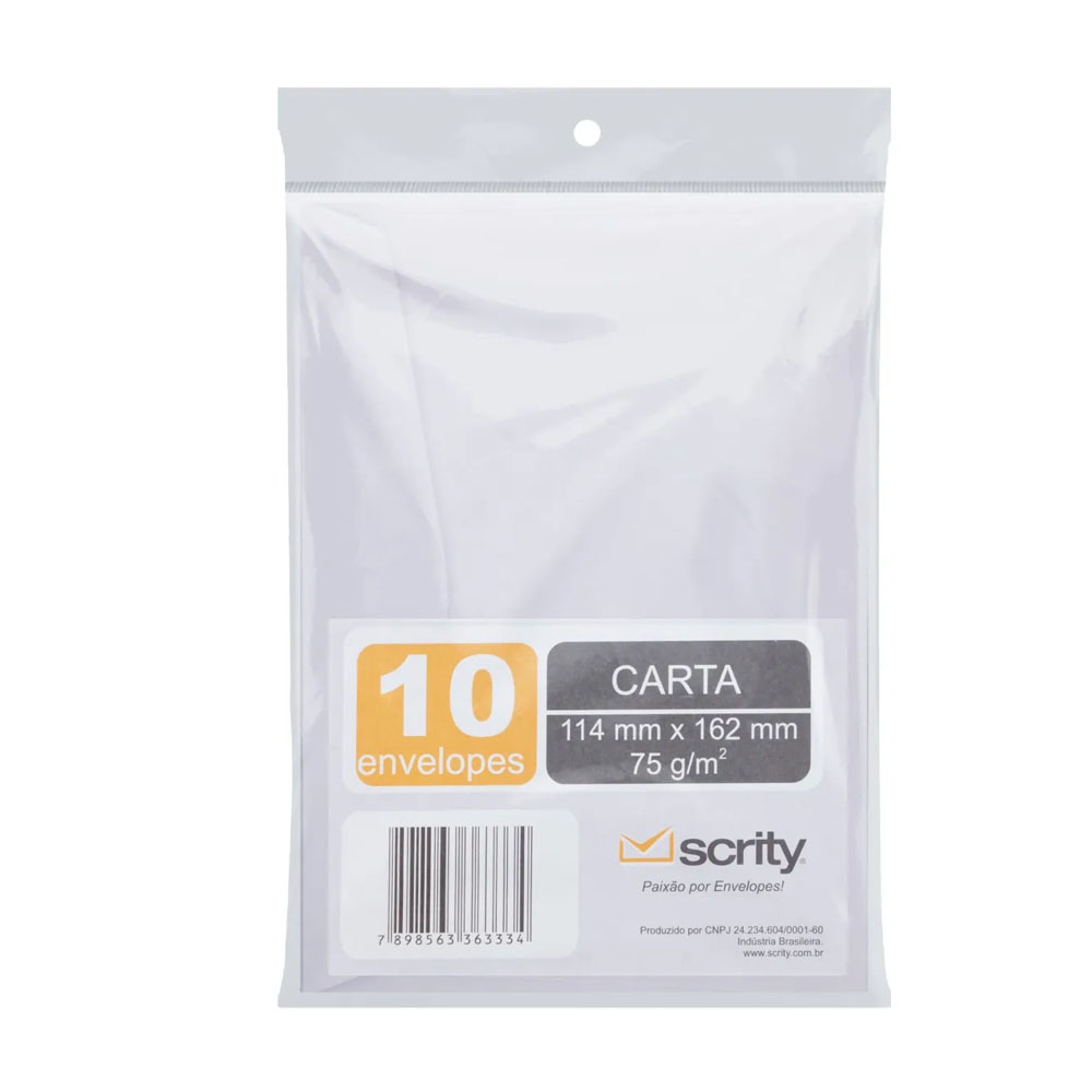 Envelope Branco produzido com papel offset 63 g/m² Tamanho: 114 x 162 mm Pacote: 10 envelopes