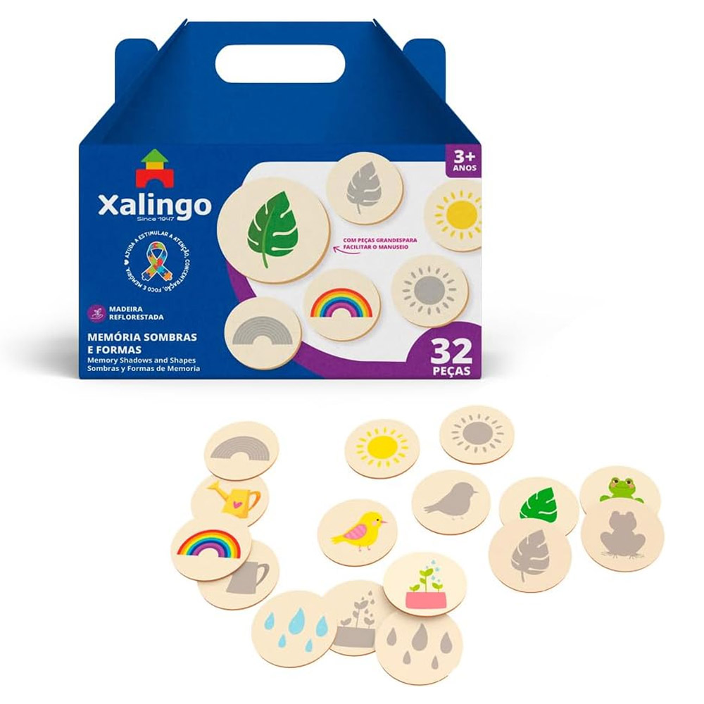 O jogo acompanha 32 peças grandes em madeira reflorestada.