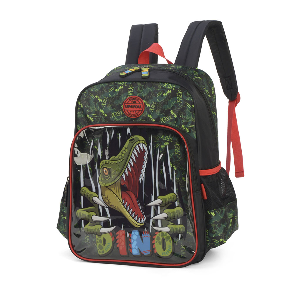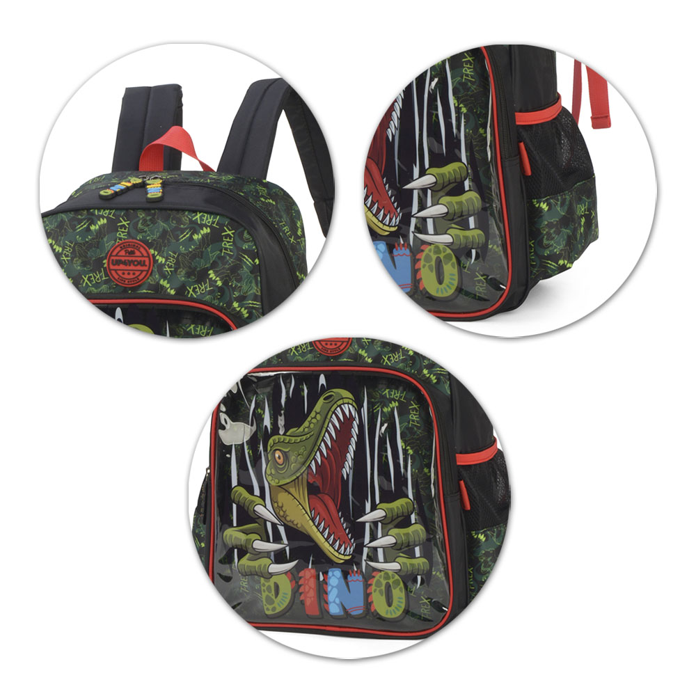 Com um design atrativo de dinossauros, possui 20 litros de capacidade, ideal para livros, cadernos e materiais escolares.