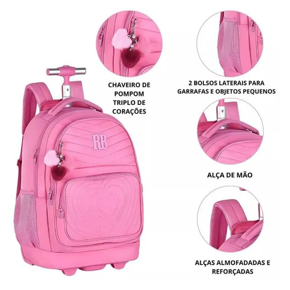 Aclamada entre as fashionistas, Rebecca Bonbon, retorna com as principais tendências. Novas linhas com aplicações variadas e acessórios diferenciados reafirmam que a combinação entre moda e Volta às Aulas é sucesso garantido. A mochila é confeccionada em material soft com matelassê e placa de metal colorido, acompanha chaveiro de pompom triplo de corações. Possui compartimento para guardar alças para melhor desempenho no modo mala e compartimento para notebook. Alças de costas acolchoadas e ajustáveis. Amplo compartimento principal, costura reforçada para melhor duração e proteção.
