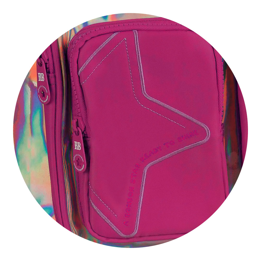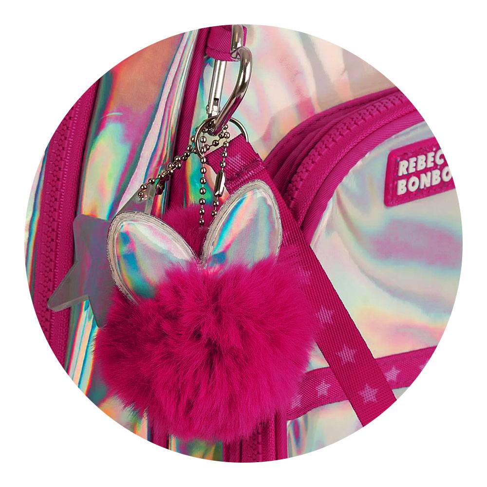 Apresentando a coleção 2026, Rebecca Bonbon retorna com as principais tendências de moda. Aclamada entre as fashionistas, a famosa Bulldog francesa inspira novas linhas com diversas aplicações e acessórios, reafirmando a combinação de sucesso entre moda e o período de Volta às Aulas. Produto em PVC holográfico com bordado de estrela, patches no painel frontal e etiqueta de borracha. Acompanham chaveiro pompom com orelhinhas, cadarço e estrela de acrílico.