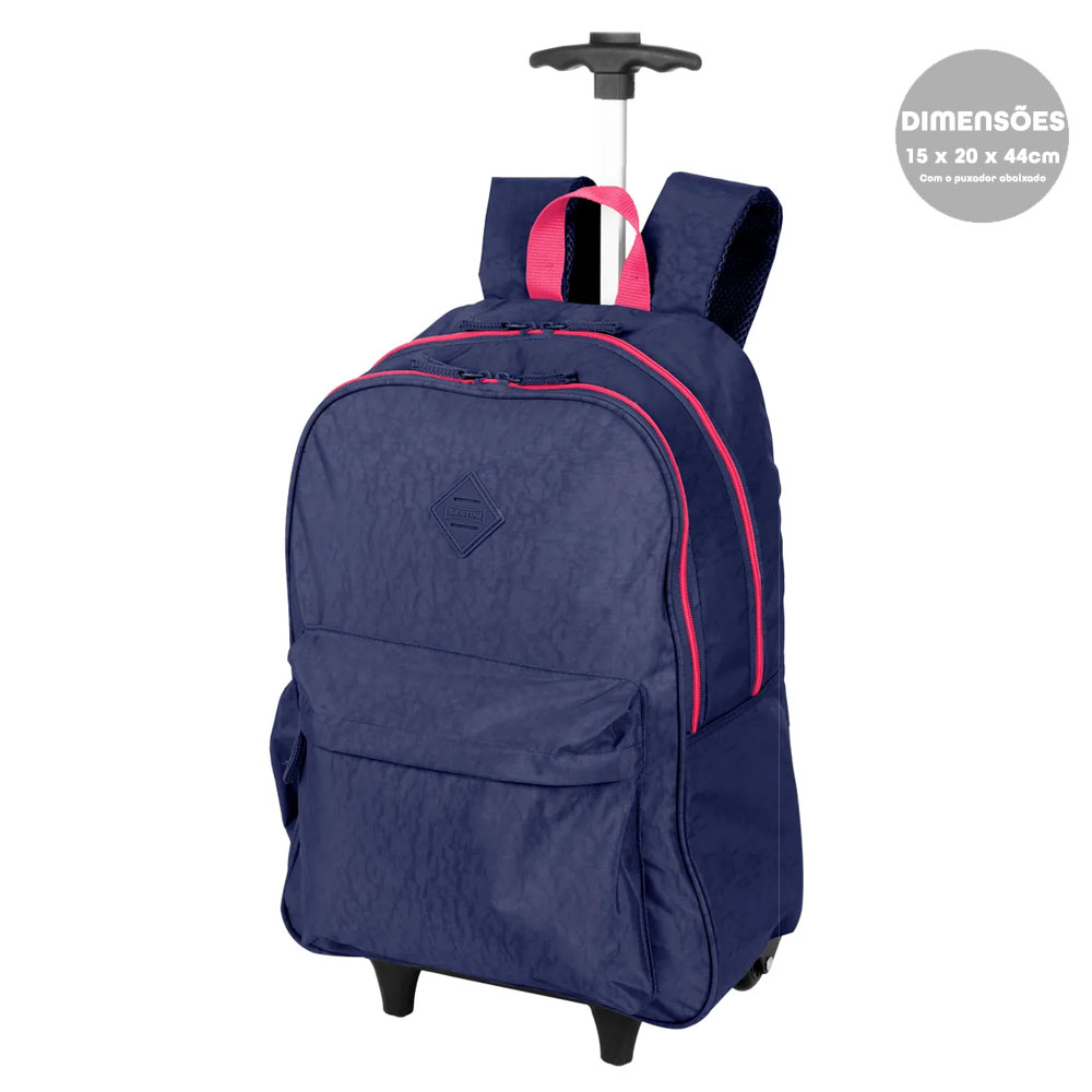 com 2 rodinhas fixas, alças acolchoadas proporcionando maior conforto.