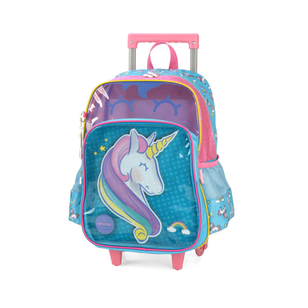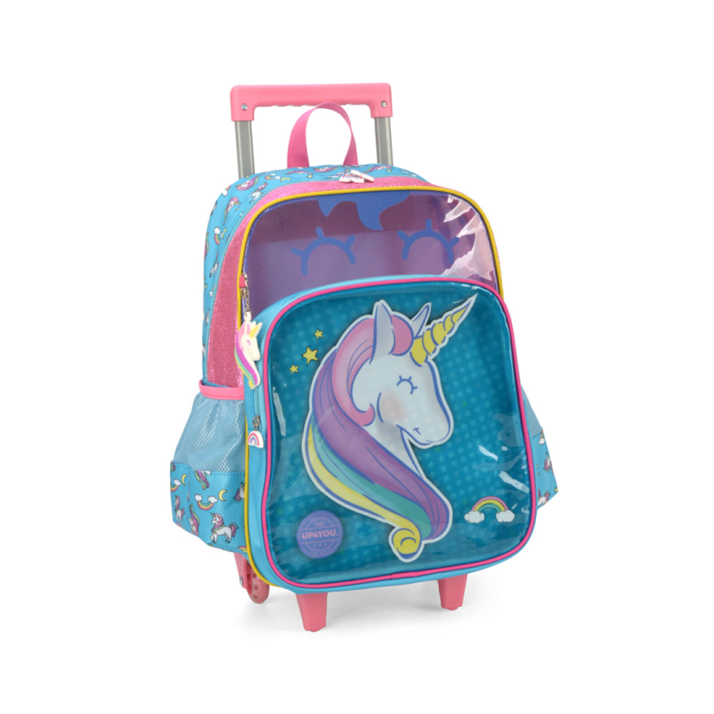 Mochila de rodinhas com alça, bolsos laterias em tela com elástico, alças de costas espumadas e reguláveis, silk frontal, bolso frontal com zíper, alça de mão.