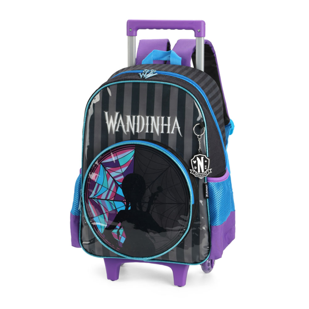 Com essa mochila de rodinhas Da Wandinha, ir para a escola nunca foi tão divertido. A mochila conta com amplo principal, bolso frontal e dois bolsos laterais de elástico para que você possa levar seus objetos com toda a segurança e ergonomia necessária. Com puxadores personalizados e carrinho em metal. A mochila possui estampas modernas e divertidas para a criançada.