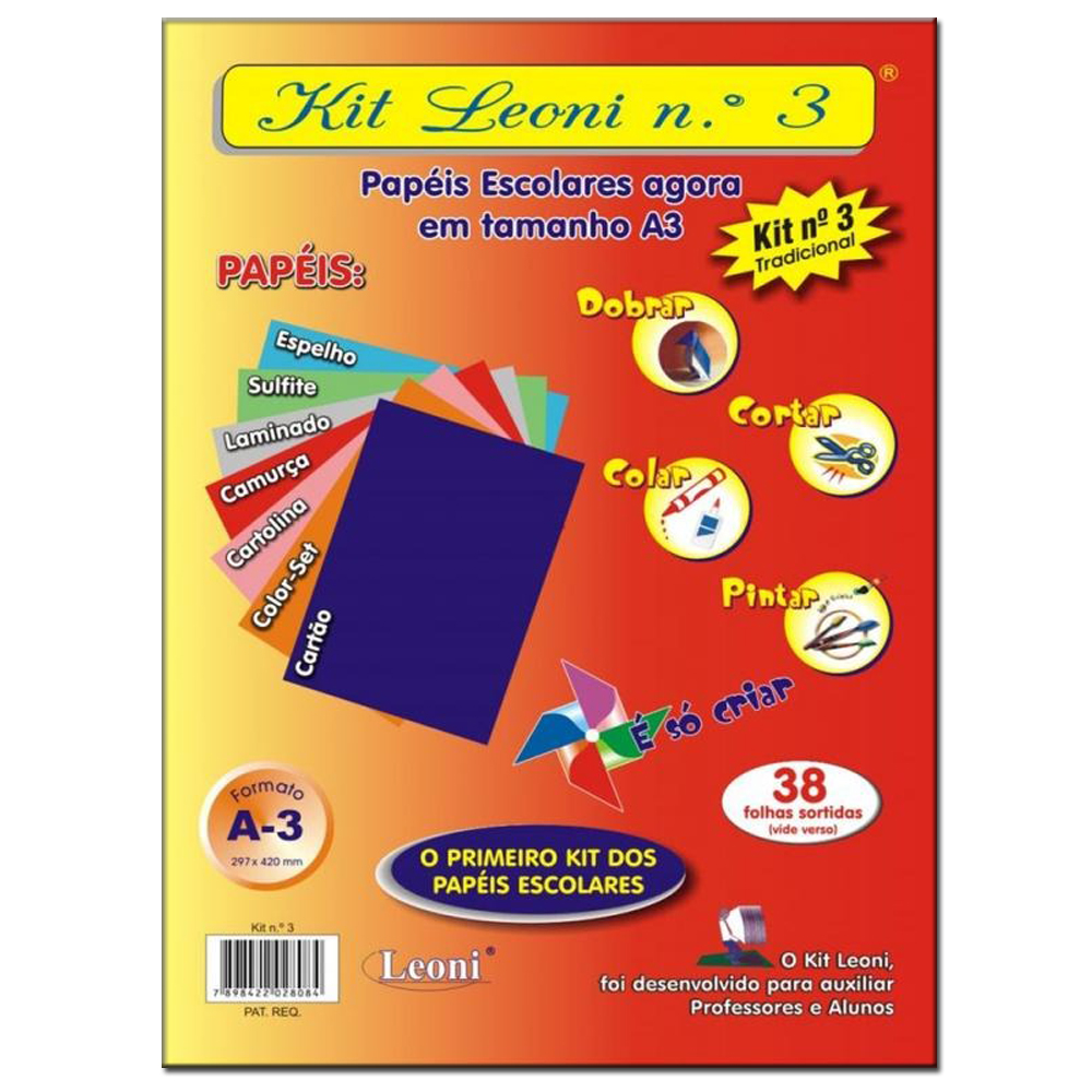 Kit Escolar Leoni nº3 Contém 38 folhas sortidas A3 Papéis: Espelho, Sulfite, Laminado, Camurça, Cartolina, Color-set e Cartão