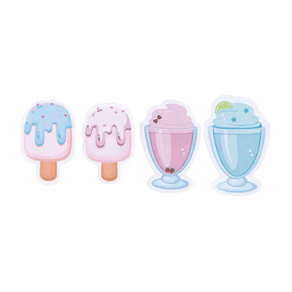 Contém diversos formatos extremamente fofos, como de donuts, cupcake, sundae, sorvete e picolé. São perfeitos para distribuir charme e cor por sua mesa, nas folhas do caderno e até em espelhos particulares. Sua mistura de cores também é uma ótima opção para decorar as páginas de bullet journals. Não existem limites para a criatividade! A cola adesiva se encontra no topo do desenho, garantindo fixação com extrema facilidade. Além disso, seu material é reciclável, reposicionável e não deixa resíduos de cola ao ser retirado.