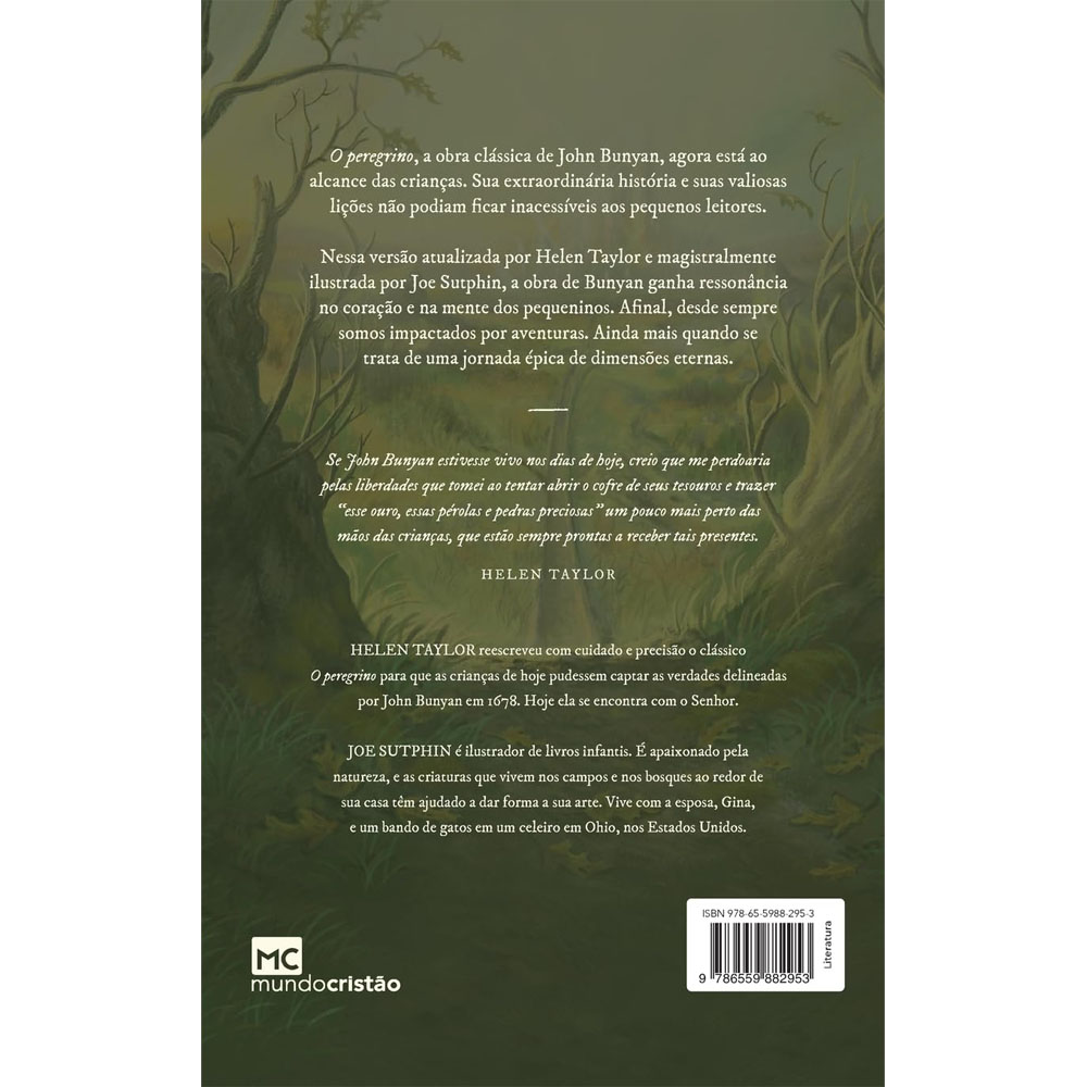 O peregrino , a obra clássica de John Bunyan, agora está ao alcance das crianças. Sua extraordinária história e suas valiosas lições não podiam ficar inacessíveis aos pequenos leitores. Nessa versão atualizada por Helen Taylor e magistralmente ilustrada por Joe Sutphin, a obra de Bunyan ganha ressonância no coração e na mente dos pequeninos. Afinal, desde sempre somos impactados por aventuras. Ainda mais quando se trata de uma jornada épica de dimensões eternas.