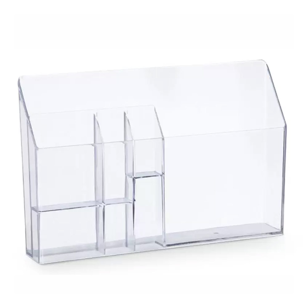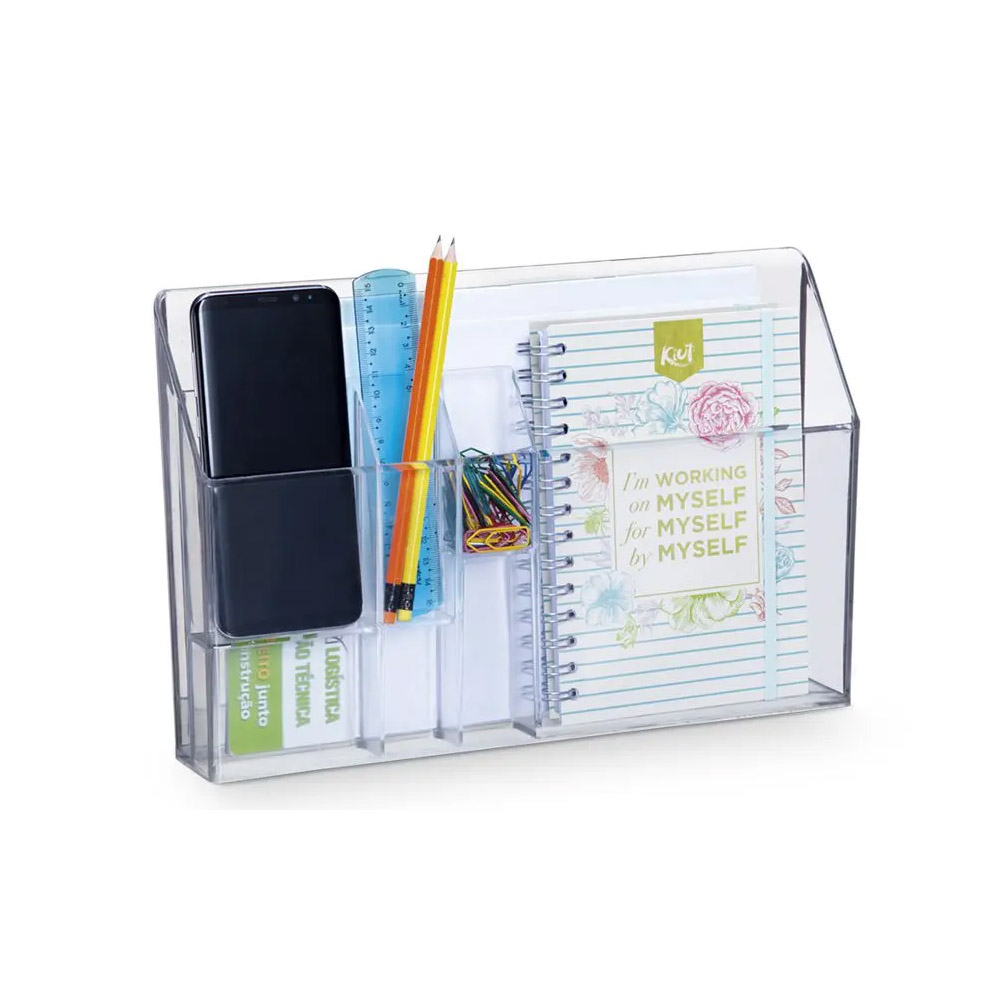 Organizador pode ser utilizado tanto fixado de messa, como na horizontal ou vertical de alguma superfície, são ideais para organização de documentos, pastas, etc. Pode ser usado também como suporte para monitor. Ideal para itens como caderno, agendas, clipes, canetas e celular. Feito em poliestireno.