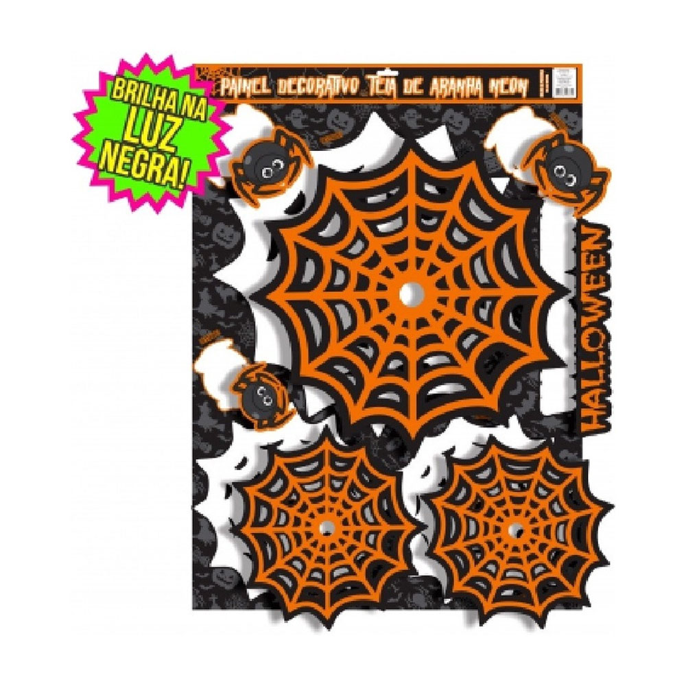 Agora a decoração da sua festa ou evento ficará ainda mais divertida e completa com o Painel Destacável Teia de Aranha, que BRILHA NA PRESENÇA DA LUZ NEGRA!