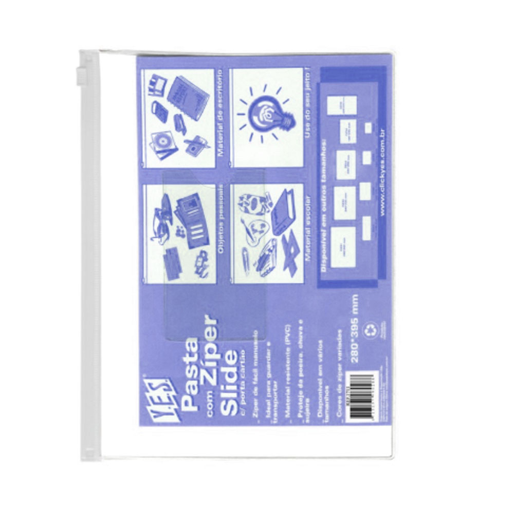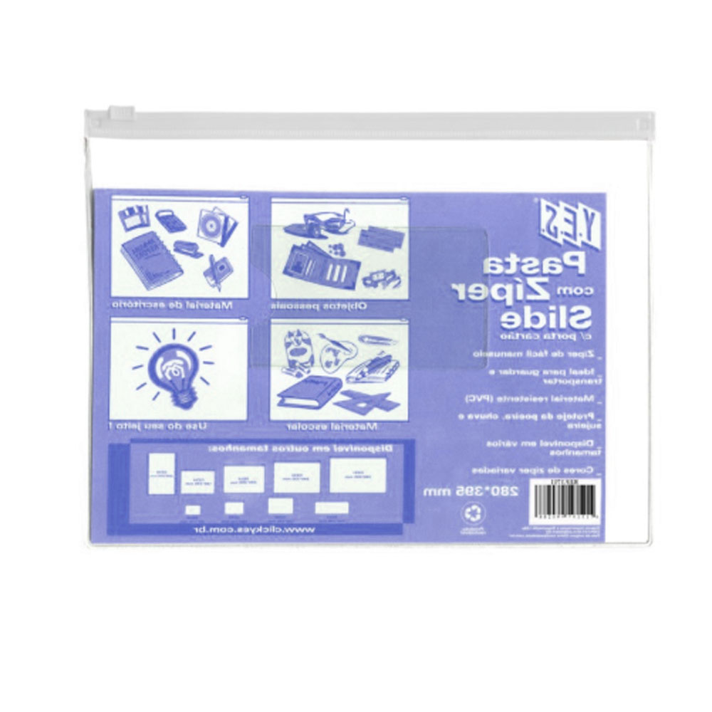 Pasta envelope com zíper plástico tipo ziplock colorido. A pasta é em PVC transparente e possui porta-cartão. Solda eletrônica de alta resistência para transporte de materiais Dimensões: 280x395mm