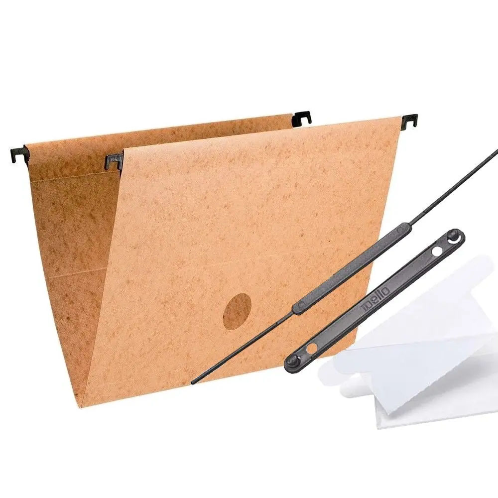 Pasta suspensa em cartão kraft. Acompanha visor e etiqueta, grampo plástico e hastes plásticas removíveis.
