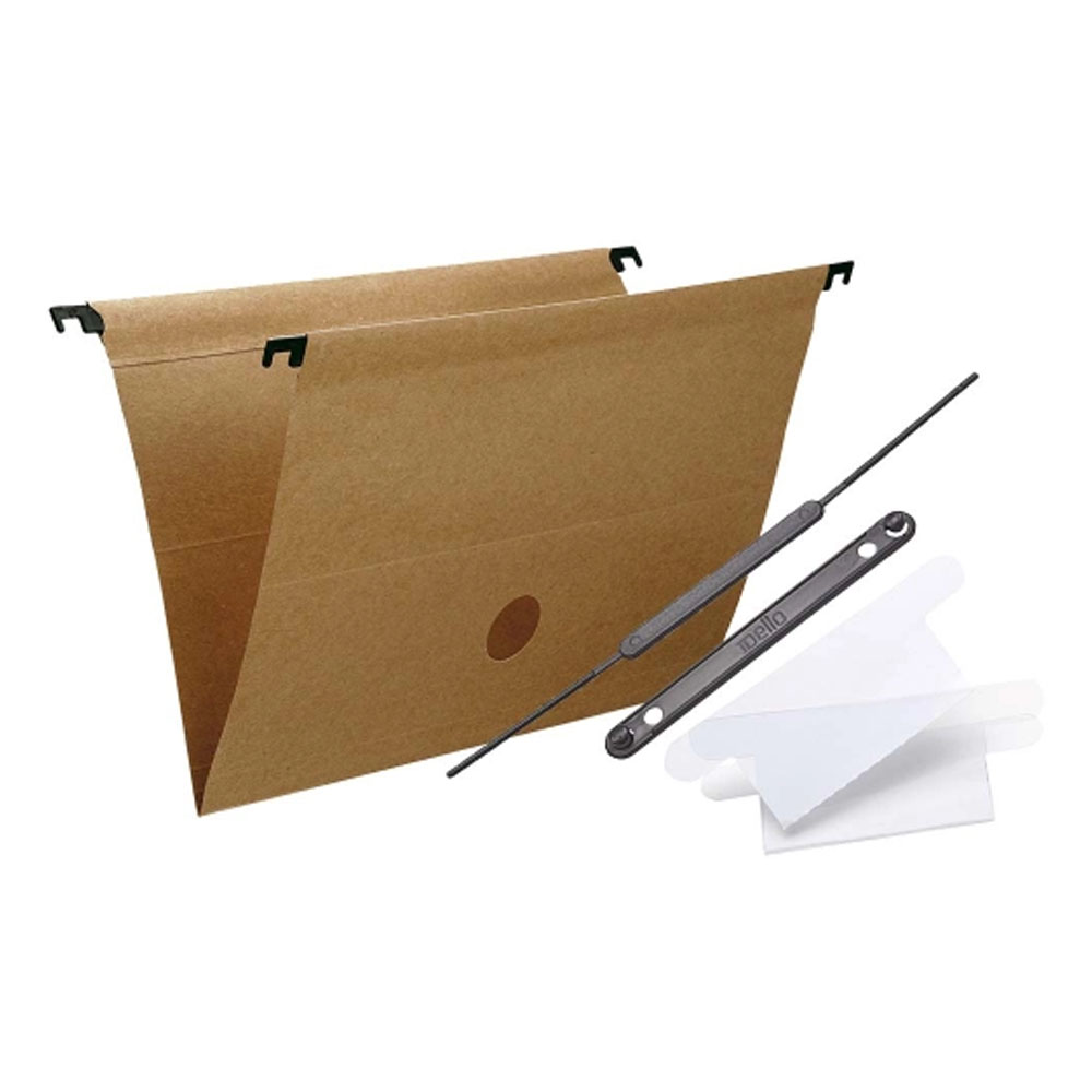Pasta suspensa em cartão kraft (170g/m²). Acompanha visor e etiqueta, grampo plástico e hastes plásticas removíveis.