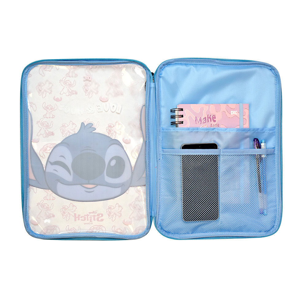 Com um design exclusivo, ela é feita de material resistente e possui um zíper que garante total segurança para seus documentos e cadernos. Ideal para estudantes que buscam funcionalidade, proteção e um toque de diversão no dia a dia. Leve seu companheiro Stitch para onde for e arrase na organização!