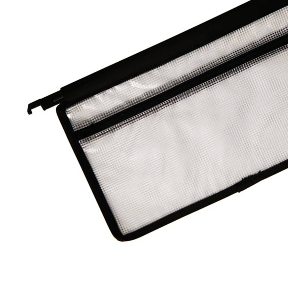 Pasta suspensa em material plástico com poliamida trançada e transparente com zíper. Possui hastes plásticas e bordas em tecido com costura reforçada. Pode também ser usada em fichários com 4 argolas.