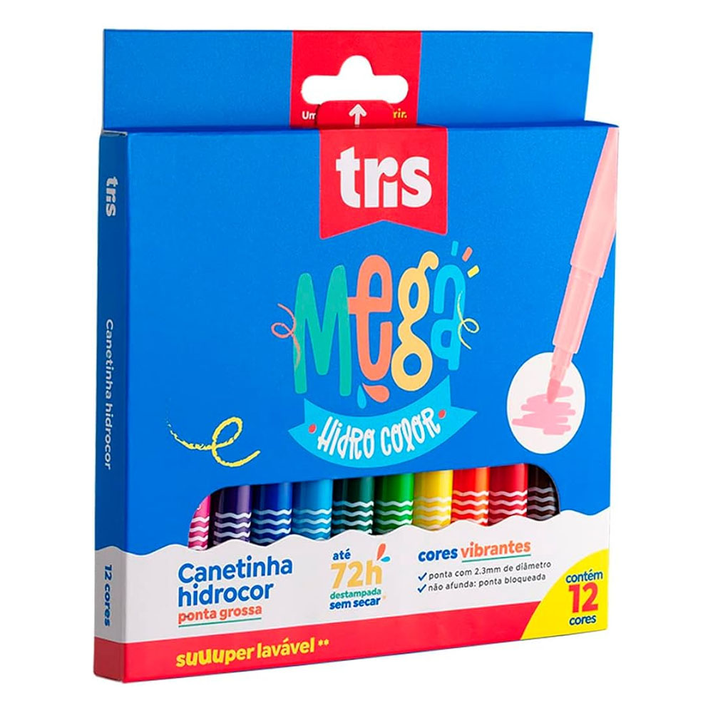 Canetinha Mega hidrocolor Tris 12 cores têm um diâmetro mais grosso que o normal que facilitam a pegada na hora de desenhar, ajudando no desenvolvimento da coordenação motora.