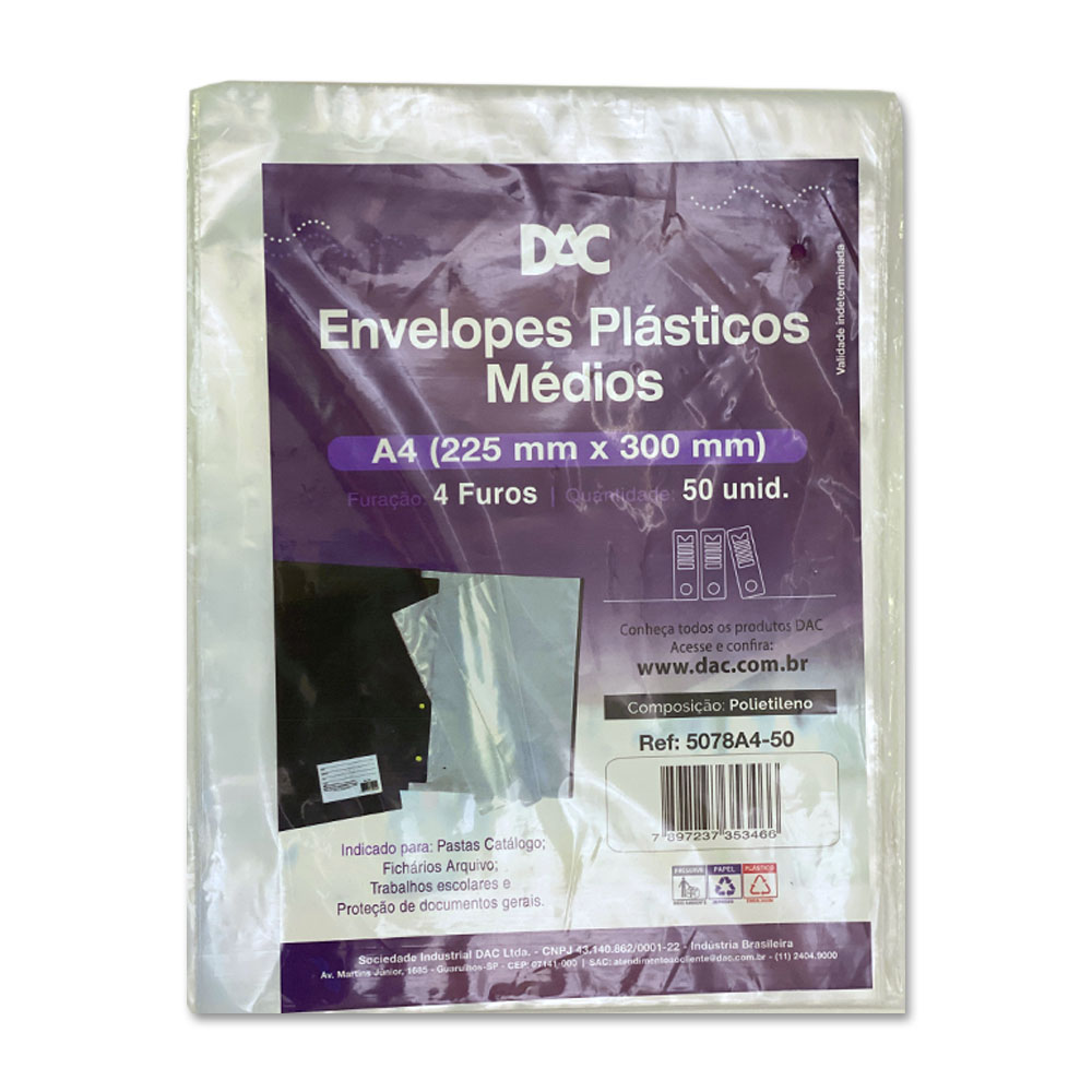 Envelopes plásticos médio dac, é ideal para você que precisa arquivar algum documento de forma organizada, este envelope é ideal para fichários e pastas, garantindo que seus papéis fiquem livres de danos e em excelente estado.