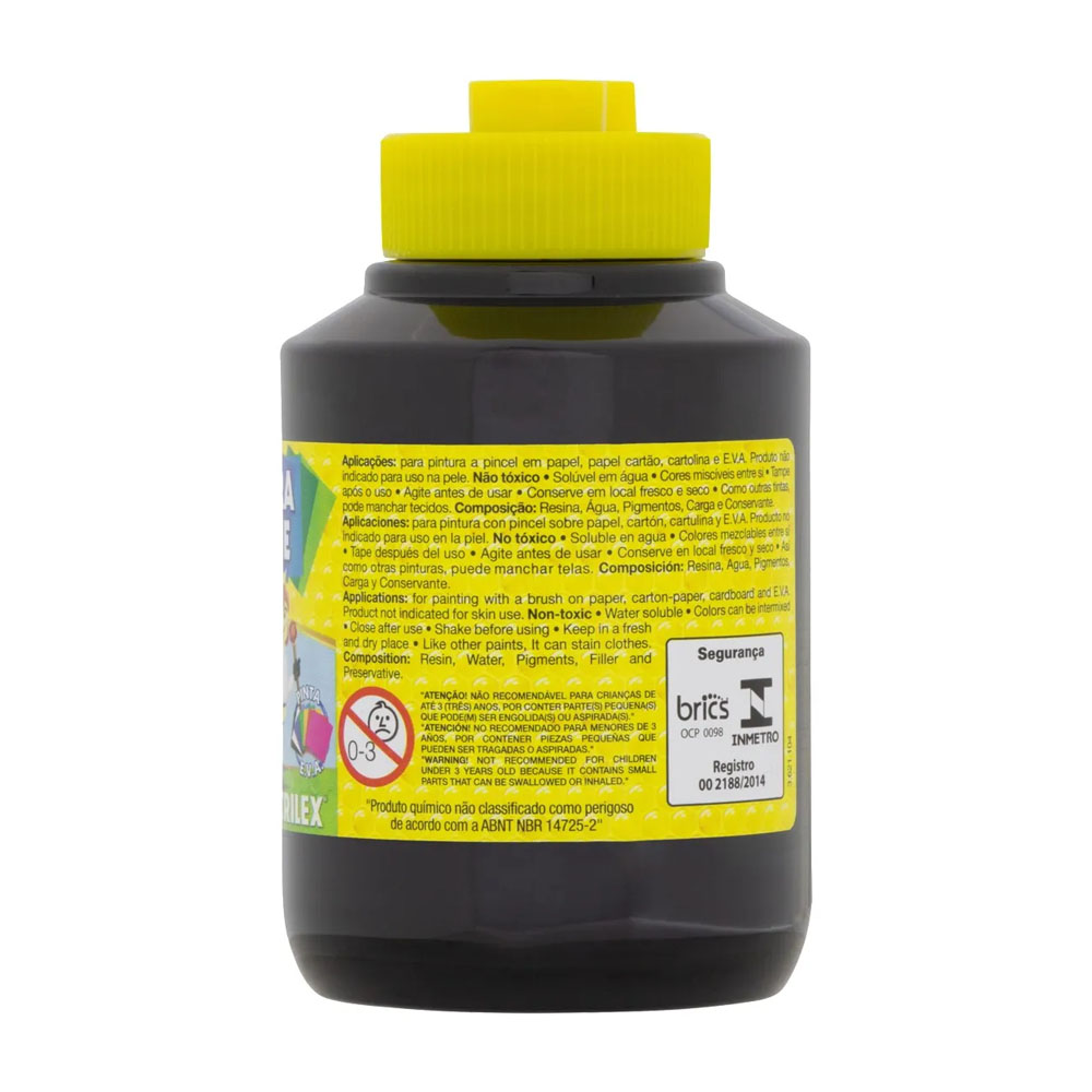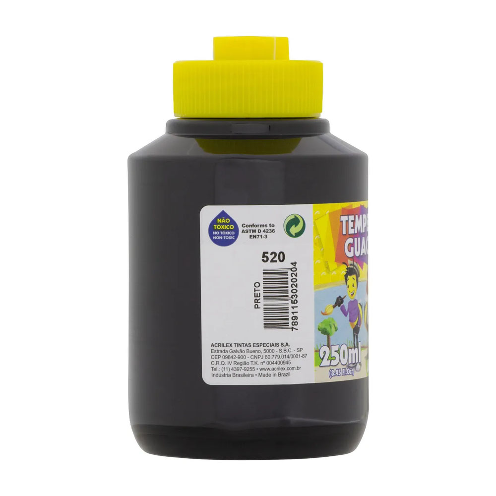 Tinta Tempera Guache Preto Acrilex A Tempera Guache Acrilex é um importante instrumento para o desenvolvimento da criatividade, coordenação motora e percepção visual das cores. Pode ser aplicada em papel, papel cartão, cartolina, gesso, madeira e cerâmica. Produto não tóxico. Embalagem: 250ml – 520.