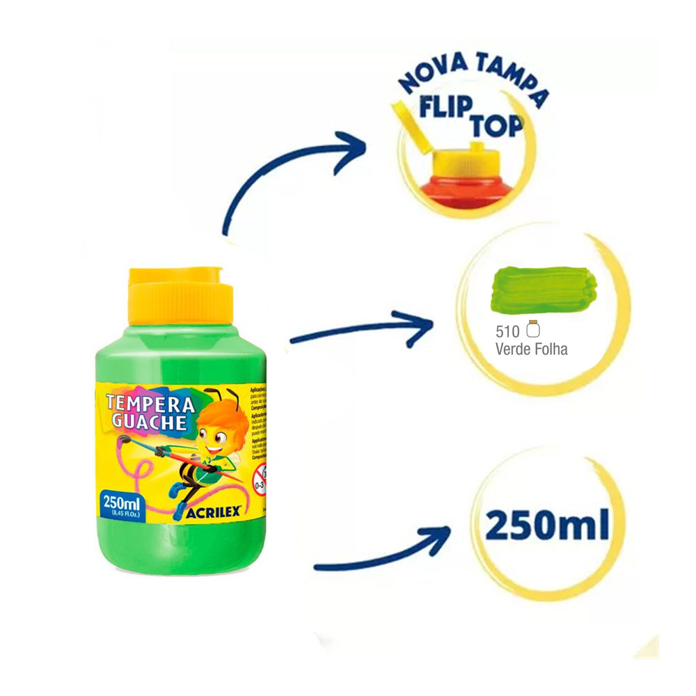 Tinta Tempera Guache da Acrilex é um importante instrumento para o desenvolvimento da criatividade, coordenação motora e percepção visual das cores. Pode ser aplicada em papel, papel cartão, cartolina, gesso, madeira e cerâmica. Produto não tóxico.