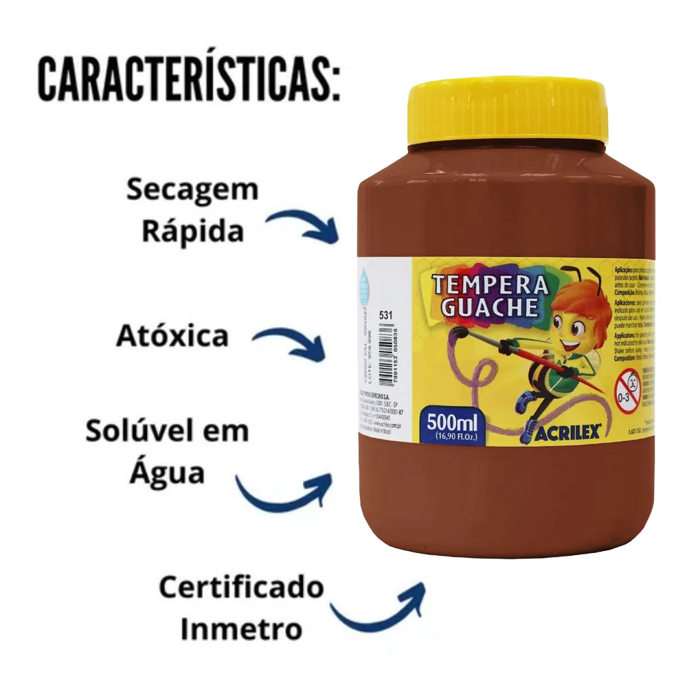 A Tinta Tempera Guache Acrilex é um importante instrumento para o desenvolvimento da criatividade, coordenação motora e percepção visual das cores. Pode ser aplicada em papel, papel cartão, cartolina, gesso, madeira e cerâmica.