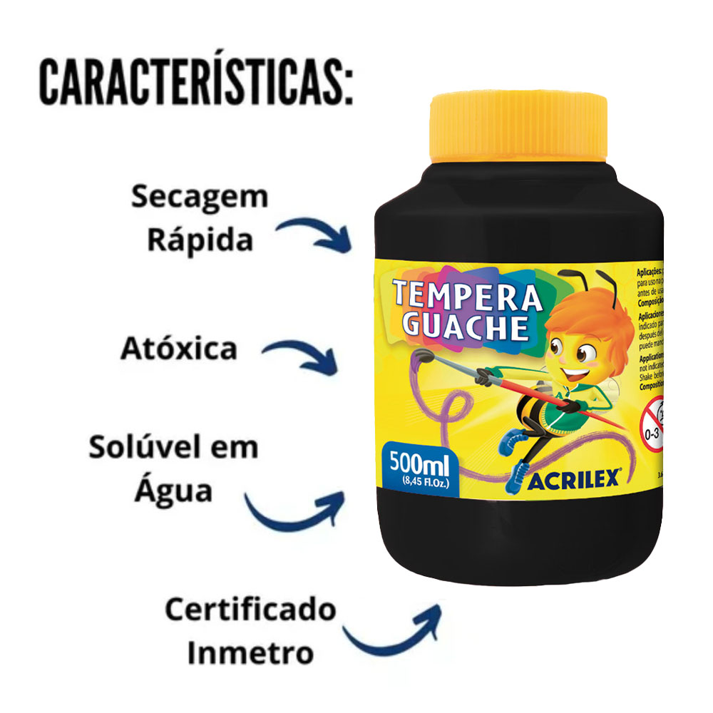A Tinta Tempera Guache Acrilex é um importante instrumento para o desenvolvimento da criatividade, coordenação motora e percepção visual das cores. Pode ser aplicada em papel, papel cartão, cartolina, gesso, madeira e cerâmica.