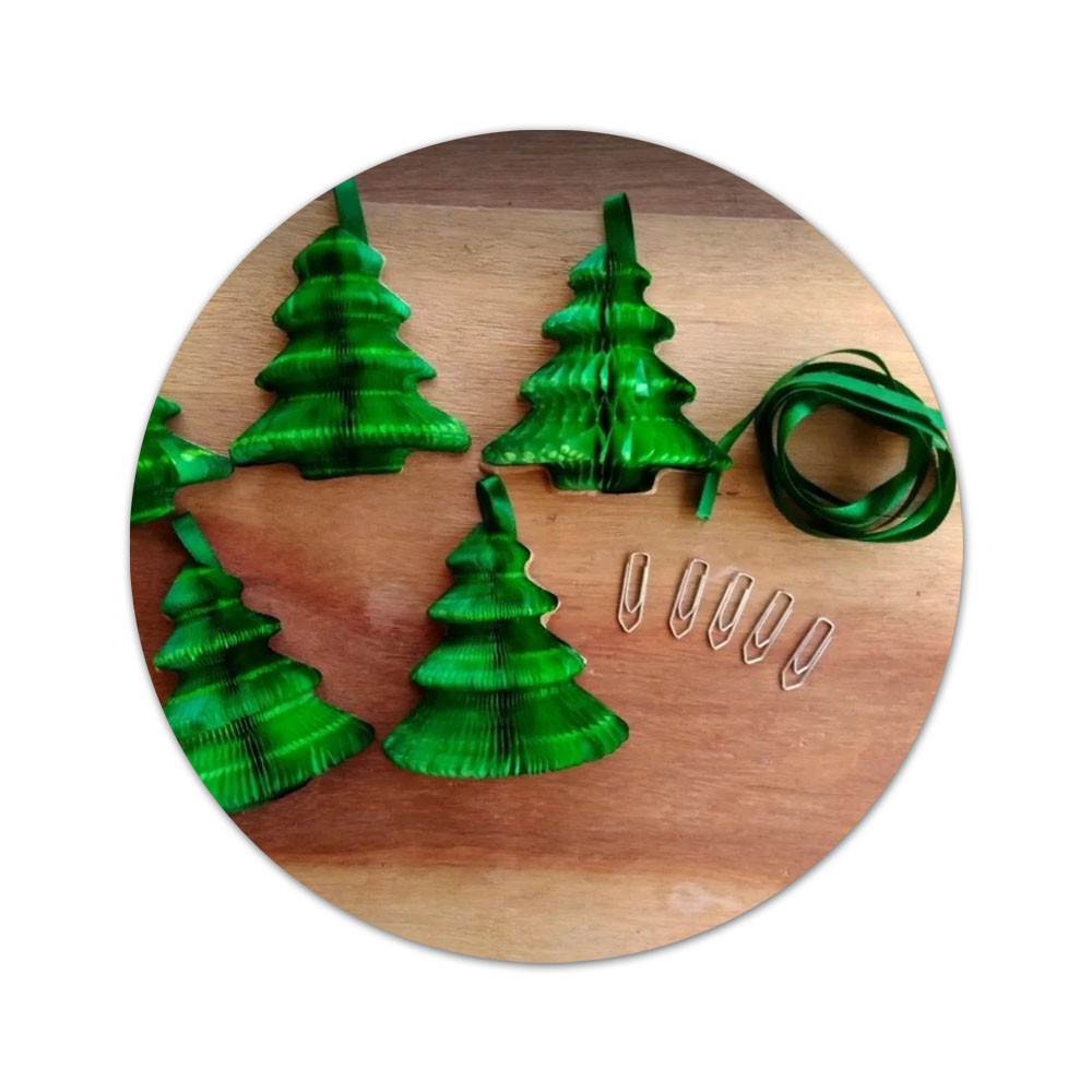 – Embalagem: 5 Árvores De Natal em papel colméia, 5 clips de metal e um fitilho; – A árvore já vem fitinha, ideal para pendurar; – Tamanho aproximado de cada árvore: (L)7 x (A)10CM;