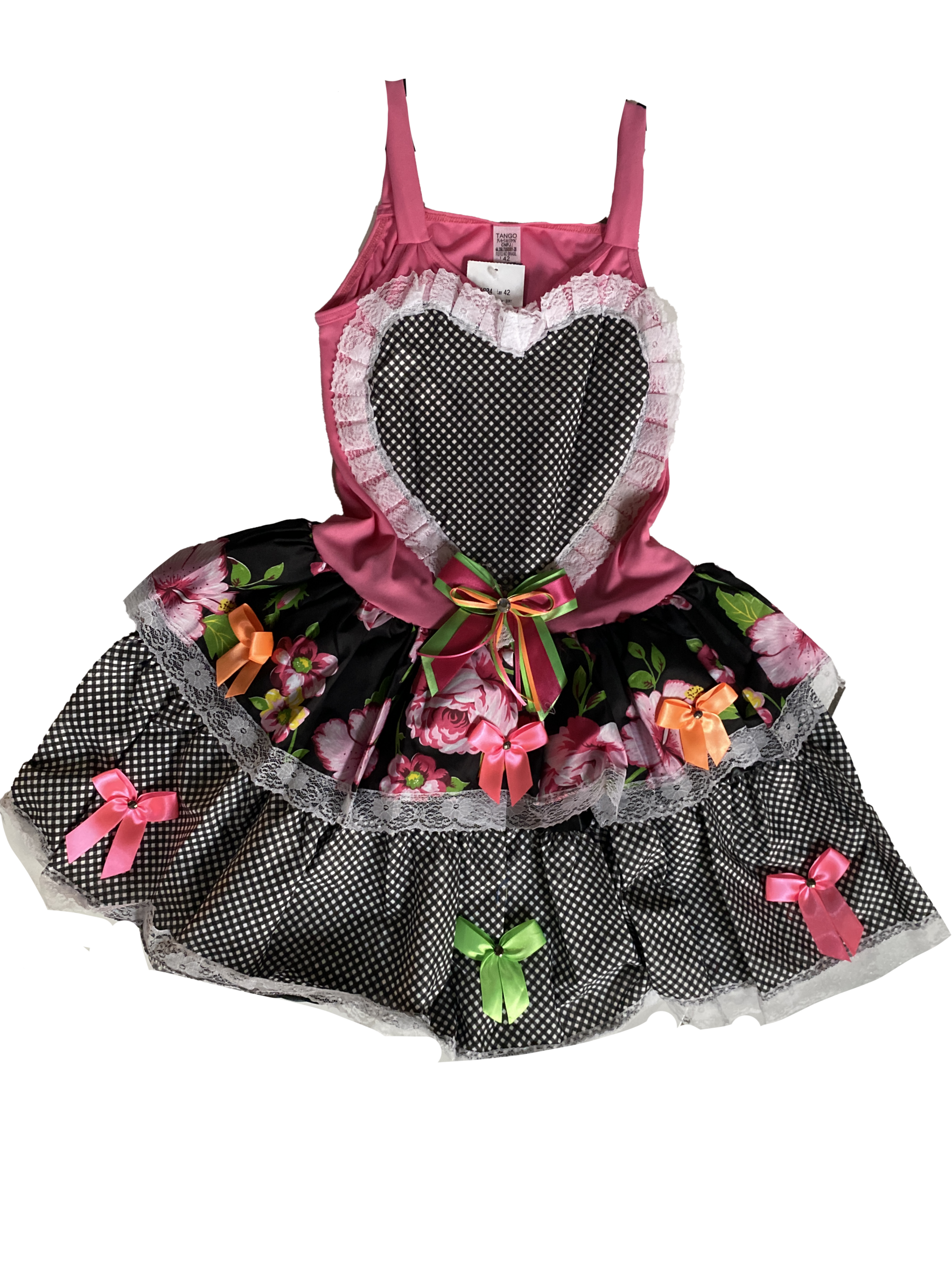 O vestido junino adulto linha confort é de alcinhas, com corpo de helanca e coração em tecido sobreposto, adornado com laço de cetim, pedra e fitas coloridas. A saia floral com renda e lacinhos e a saia xadrez complementam o visual, com calçola inclusa.