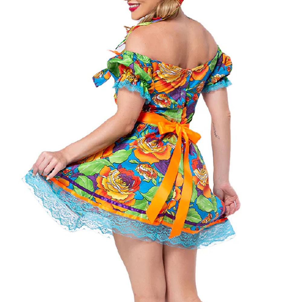 Vestido junino linha confort, estilo ciganinha, com corpo em helanca e lacinhos no decote. Saia rodada com babados, tecidos contrastantes, fitas de cetim e rendas. Cinto em cetim que dá um toque a mais.