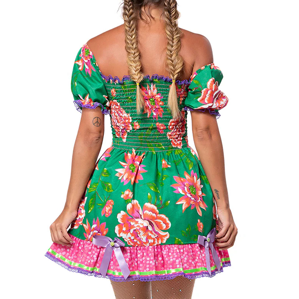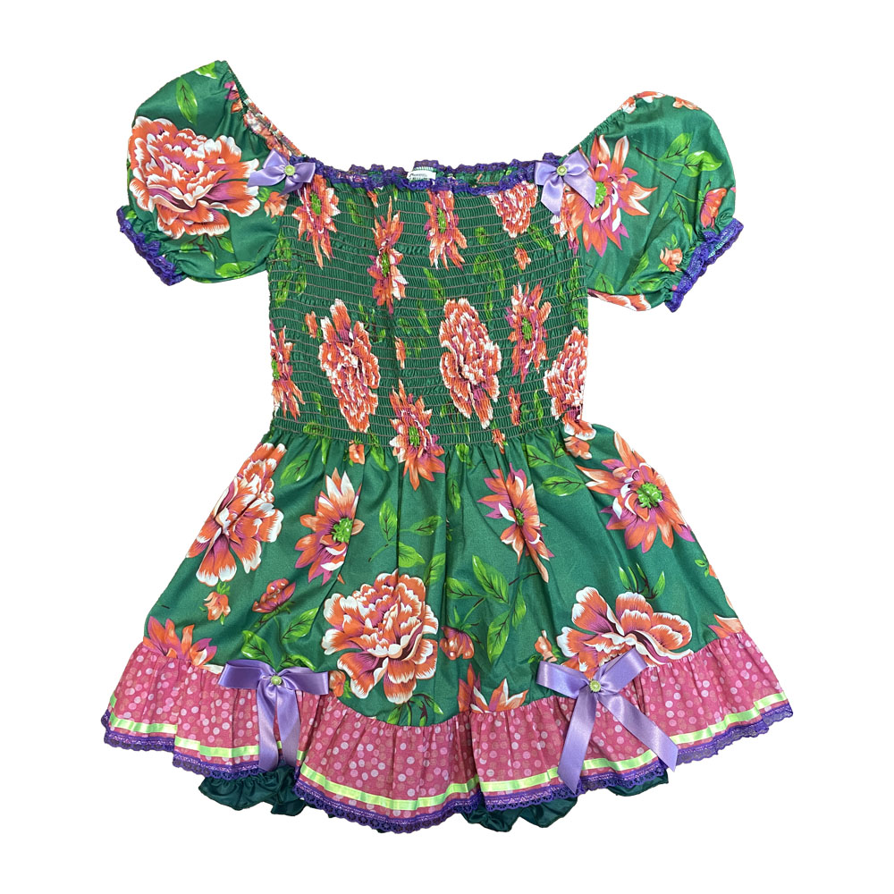 Mangas bufantes com renda colorida. Saia rodada com babados contrastantes e fita de cetim. Acompanha calçola (shorts).
