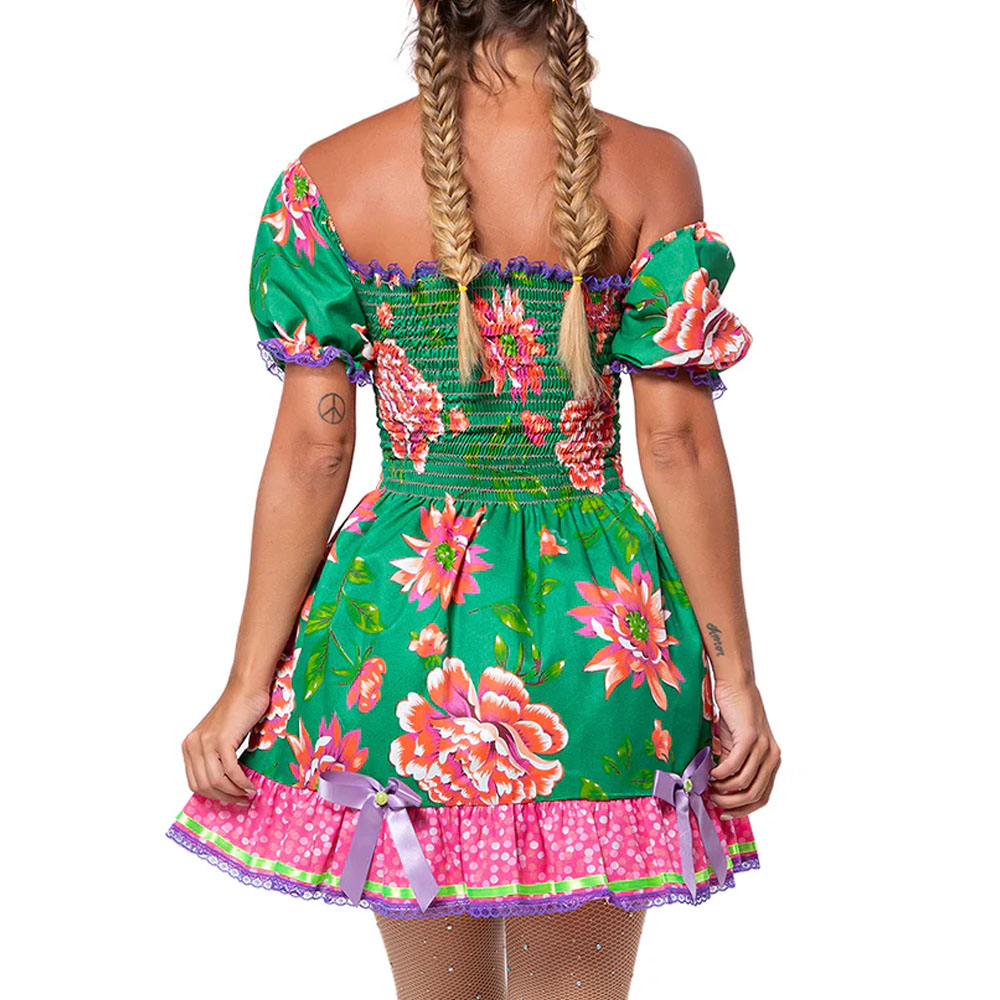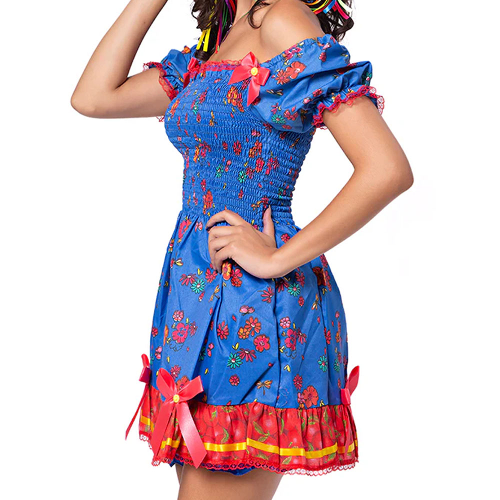Mangas bufantes com renda colorida. Saia rodada com babados contrastantes e fita de cetim. Acompanha calçola (shorts).